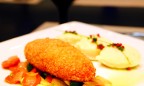 В данном случае, все, к счастью, совсем по‑другому: золотистая хрустящая корочка из настоящих пшеничных крошек, под ней — сочное рыбное филе (снова — без костей, но на всякий случай в меню отмечены блюда, в которых могут попасться мелкие кости), приправленное только солью и свежемолотым черным перцем. Рыбный запах есть, но это показатель честности, свежести и натуральности. Дополняют котлету идеально бланшированные овощи (цукини, морковь, лук и чеснок), яркие на цвет и вкус, сочные и хрустящие, а также нежное картофельное пюре со сливками, украшенное молотым розовым перцем и перышками шнитт-лука.