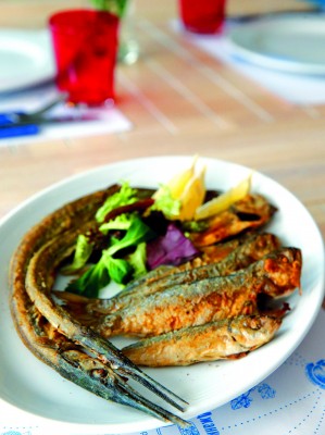 Тем, кто не любит рыбного запаха, лучше всего заказать калкана (черноморскую камбалу), запеченную с крымскими травами и крымскими овощами (100 г, 90 грн), которого подают с соусом тартар на основе домашнего майонеза с добавлением крымского лука, крымских же каперсов, маринованного огурца и укропа. У него нет специфического привкуса, мясо — нежное и упругое, самое вкусное (и полезное для костей и суставов) — у ребрышек. Любителям мелкой рыбки (той, которая, «как семечки») понравится «Улов дня», в который могут войти, например, сарган, ставридка и луфарь (30‑45 грн за 100 г).