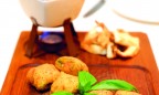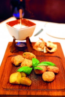 Североитальянское фондю (400 г, 116 грн): в расплавленный сыр «Бегадер» с голубой плесенью окунаются «пирожки» — фаготини — рулетики из цуккини в панировке с начинкой из моцареллы, кругленькие крокеты из сырной поленты и кусочки печеного картофеля.