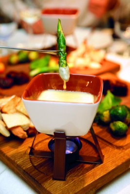 Овощное фондю (400 г, 108 грн): расплавленная смесь сыров «Гауда» и «Эдам» с трюфельным маслом, в которую вы сможете макать кусочки бланшированной спаржи, головки брюссельской капусты, кубики запеченной в хоспере свеклы и подкопченной тыквы.