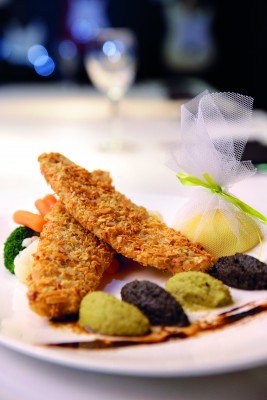 Осеннее меню радует своей непривязанностью ни к «сезонным овощам», ни к каким‑то другим условностям. Филе сибаса в миндальной панировке с паровыми овощами и тапенадой из маслин и оливок (220 / 150 г, 189 грн) — спокойное блюдо для любителей здорового питания. Гарнируется рыба паровыми беби-морковкой, цветной и брюссельской капустой. В силу щадящей готовки овощи сохраняют цвет и вкус. Обе тапенады не испорчены никакими приправами, что тоже очень приятно. Чистый понятный вкус, хорошо сочетающийся с белой рыбой в хрустящих ореховых хлопьях.