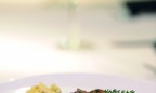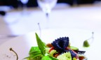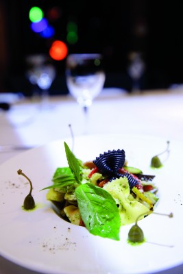 Кроме меню Slow Cooked, Виталий Терещенко ввел еще два раздела — сезонное Осеннее меню и Вегетарианское. Салат с печеными овощами с соусом песто, фарфалле и сыром пармезан (265 г, 75 грн) из Вегетарианского меню — легкое и питательное блюдо. Разноцветные бантики — фарфалле с натуральными красителями (соки овощей и чернила каракатицы) — аль денте, овощи (цукини, баклажан, сладкий перец) — сочные, яркие и хрустящие.