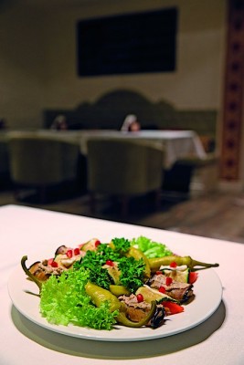 Кстати о здоровье. На грузинской свадьбе вам никогда не предложат слоеную жирную ачму без стакана мацони — так полезней для пищеварения. Чтобы сытно пообедать или поужинать, не перегружая желудок, можете начать с «Ассорти по‑грузински» (315 г, 58 грн) — рулетиков из тонких ломтиков обжаренных баклажанов и цуккини и острых перчиков, фаршированных свежим сыром шор, смешанным со сметаной, чесноком и укропом и ореховой пастой. Можно заказать каждый фаршированный овощ по отдельности.