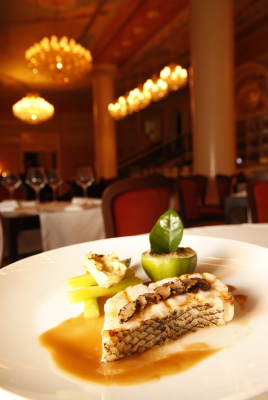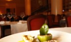Не угадала я с основным блюдом и десертом. Стейк из чилийского сибаса с трюфелями в соусе из сливочного масла (140/45/35 г, 135 грн) напомнил басню дедушки Крылова «Мартышка и очки»: уж я и так его, и эдак… На гарнир к сочному и довольно жирному стейку, украшенному «чешуйками» из ломтиков черного трюфеля, подаются сложенные как «городошная» фигура стебли зеленой спаржи, увенчанные половинкой маринованного артишока. Связать компоненты блюда должен соус на основе сливочного масла с соевым соусом и лаймовым фрешем (половинка обожженного на гриле лайма с листиком прилагается, чтобы приправить рыбу). Вывод — это блюдо нужно есть, сложив кусочки всех ингредиентов пирамидкой, наколов на вилку и обмакнув в соус. Иначе вас постигнет разочарование.