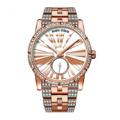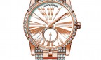 Мануфактура Roger Dubuis — единственная компания, все изделия которой маркируются самым престижным часовым знаком качества — Женевским клеймом. Но надпись Geneve не сразу бросается в глаза, чего не скажешь о драгоценных камнях, которыми украшена новая модель Excalibur 36. Инкрустированный 48 бриллиантами безель превратился не только в красивую, но и в очень прочную деталь. Правда, ни он, ни сатинированный циферблат с родиевой отделкой не могут конкурировать с браслетом этих часов, для инкрустации которого использовано 708 бриллиантов. Excalibur 36 в корпусе из розового золота предлагается приобрести за € 64 000.