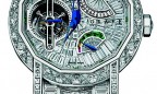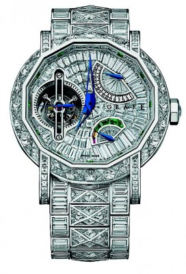 Graff издавна славится своей любовью ко всему, что блестит, но в этот раз бренд превзошел себя. В новой модели уместились сразу 634 бриллианта разных видов и огранок. Изумруды, сапфиры, рубины — если всю эту красоту и изящество сложить, получится горка весом 47 карат. При этом драгоценными камнями усыпан не только 45‑миллиметровый корпус, но и браслет. Циферблат модели оснащен центральными скелетонизированными стрелками для индикации часов и минут. Вверху находится указатель даты с одной стрелкой и арабскими цифрами. На отметке «9 часов» размещен великолепный турбийон. Тираж Diamond MasterGraff Tourbillon — 30 экземпляров.