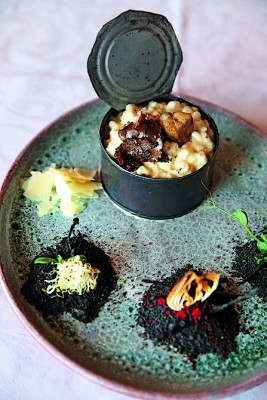 Еще одно из знаковых блюд, сервируемое с очаковским трюфелем — уже ставшее легендарным Перлотто (300 г, 89 грн). На самом деле — это гениально: рис имеет гадкую особенность развариваться, передержи его пару минут, застывать, превращаться в кашу… А долгие годы недооцениваемая перловка — всегда упруга и бодра, даже если перед этим ее распаривали в печи, а затем тушили со сливками и подали с костным мозгом или зобной железой теленка. Шеф-повар «Канапы» Артем Уразаев уверен, что такое блюдо под силу приготовить любой домохозяйке, особенно, если купить в ресторанной лавочке баночку маринованных в оливковом масле слайсов (50 г, 299 грн) или трюфельной пасты (50 мг, 249 грн).