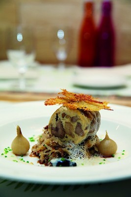Кроме трюфелей в Citronelle пока что представлены блюда из меню «Божоле». Меня покорил Куриный муслин с шукрутом и соусом «Божоле» (132 грн). Это — настоящее французское блюдо (очень в стиле шефа): свиная ножка отваривается до невероятной мягкости, снимается кожа, после чего в нее заворачивается измельченное белое куриное мясо, смешанное с грибами и сливками, и готовится по принципу баллотина. На гарнир подается тушеная квашеная капуста с подсушенными кусочками мяса с той самой свиной ножки. Веганам и вегетарианцам, разумеется, не подойдет. Для остальных — «это просто праздник какой-то».