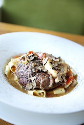 Блюда, вошедшие в специальное меню, выбраны по принципу «лучше меньше, да лучше»: идеальные комбинации классических пасты и ризотто (Лингвини с трюфелем (215 г, 50 грн), Ризотто с белыми грибами и трюфелем (300 г, 70 грн)), а также — Омлет с трюфелем и брускетта с вялеными томатами (200 г, 35 грн) и Оссобуко с трюфелем (420/150 г, 97 грн). Такой выбор не случаен: яйца — один из продуктов, кроме картофеля, птицы, телятины, пасты, ризотто и салатов, идеально сочетающихся с трюфелями. А оссобуко — классическое, легендарное и хрестоматийное блюдо из телячьей голяшки, характерное для севера Италии. К слову, когда-то у меня была идея задаться поиском идеального оссобуко в Киеве. Идею я так и не реализовала, но идеальное классическое оссобуко, думаю, нашла (как минимум одно из) — именно в «Оливке»: душистый соус с овощами (лук-морковь-сельдерей) и белым вином, который хочется выпить, наклонив тарелку; нежное томленое мясо с обязательным распаренным — хоть губами ешь — ободком из «соединительной ткани», косточка с щедрой порцией мозга, к которому трюфель как нельзя кстати, и широкая лапша паппарделе, приготовленная «аль-денте» (напомню, что пасту, как и все остальное, что можно сделать своими силами, готовят повара «Оливки»). Все блюда специального меню дополнительно приправляются трюфельным оливковым маслом. Свежего трюфеля на блюдо идет 2 грамма — идеальное количество, чтобы почувствовать аромат за несколько метров от столика и оценить вкус. При желании можно добавить гриб к любому выбранному блюду. Желательно — горячему, потому что именно при высокой температуре вкус черного трюфеля раскрывается лучше всего.