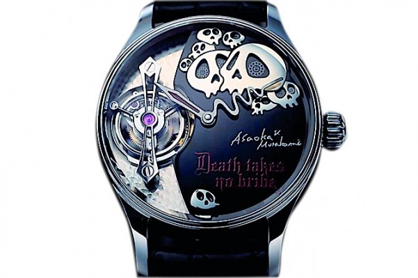 Часы с оптимистичным названием «Смерть взяток не берет» — результат сотрудничества независимого японского производителя Хаджими Асаоки и дизайнера Такаси Мураками. Более трех лет команда потратила на их создание: Асаока собственноручно изготовил и собрал механизмы и турбийоны для всех пяти копий «Death Takes No Bribe», а Мураками создал незабываемый дизайн в стиле «черных» мультфильмов Тима Бертона. Эти небольшие часы диаметром всего 42 мм снабжены индикатором минут, часов и запаса хода. При этом стоят они больше некоторых крупных хронометров — $ 75 000.